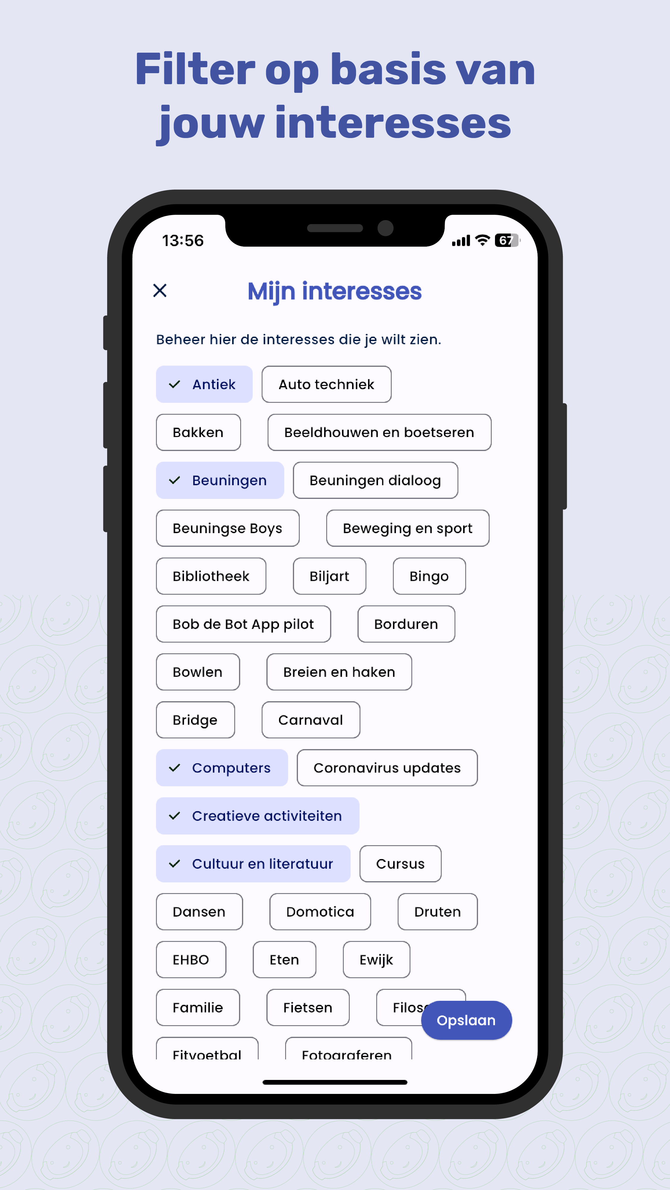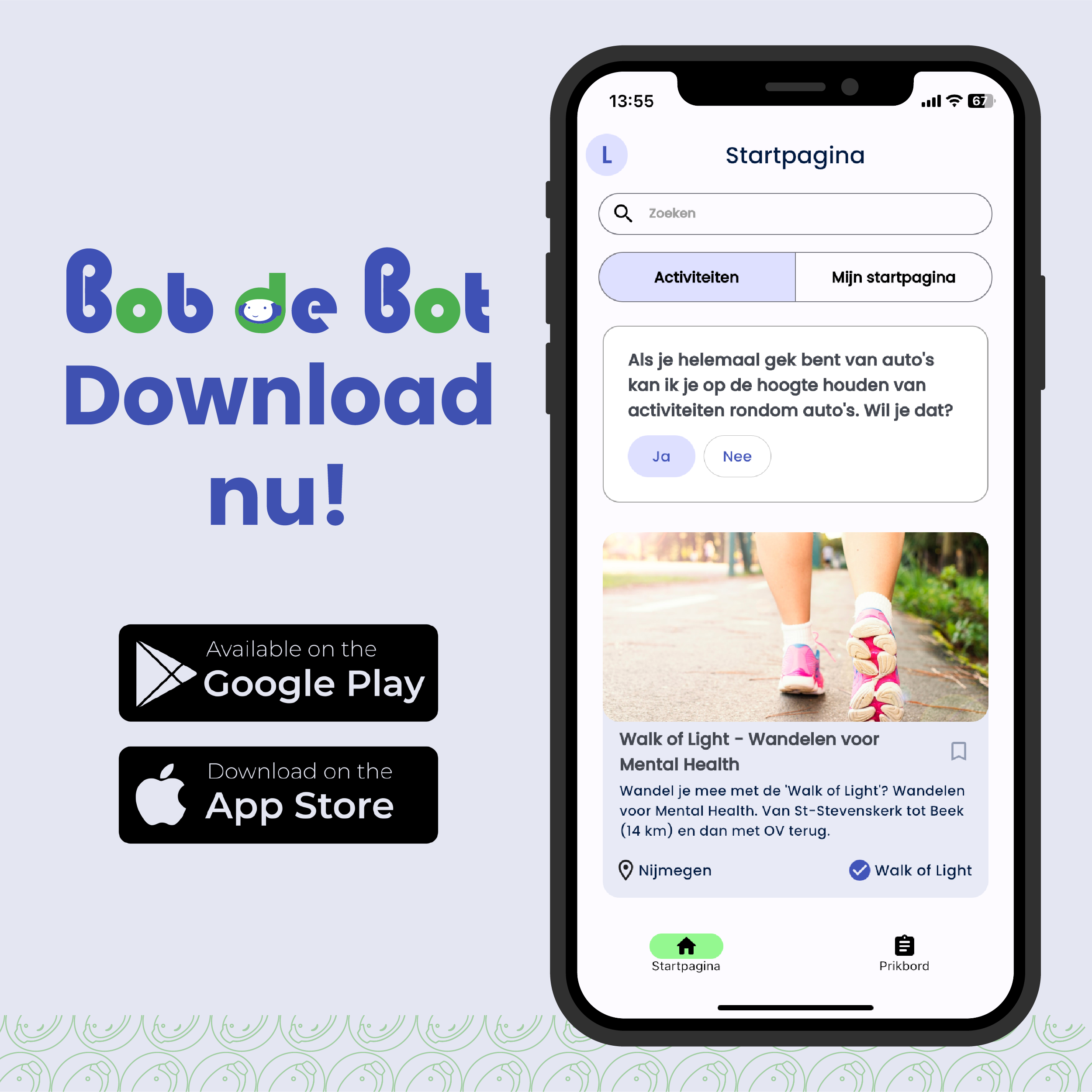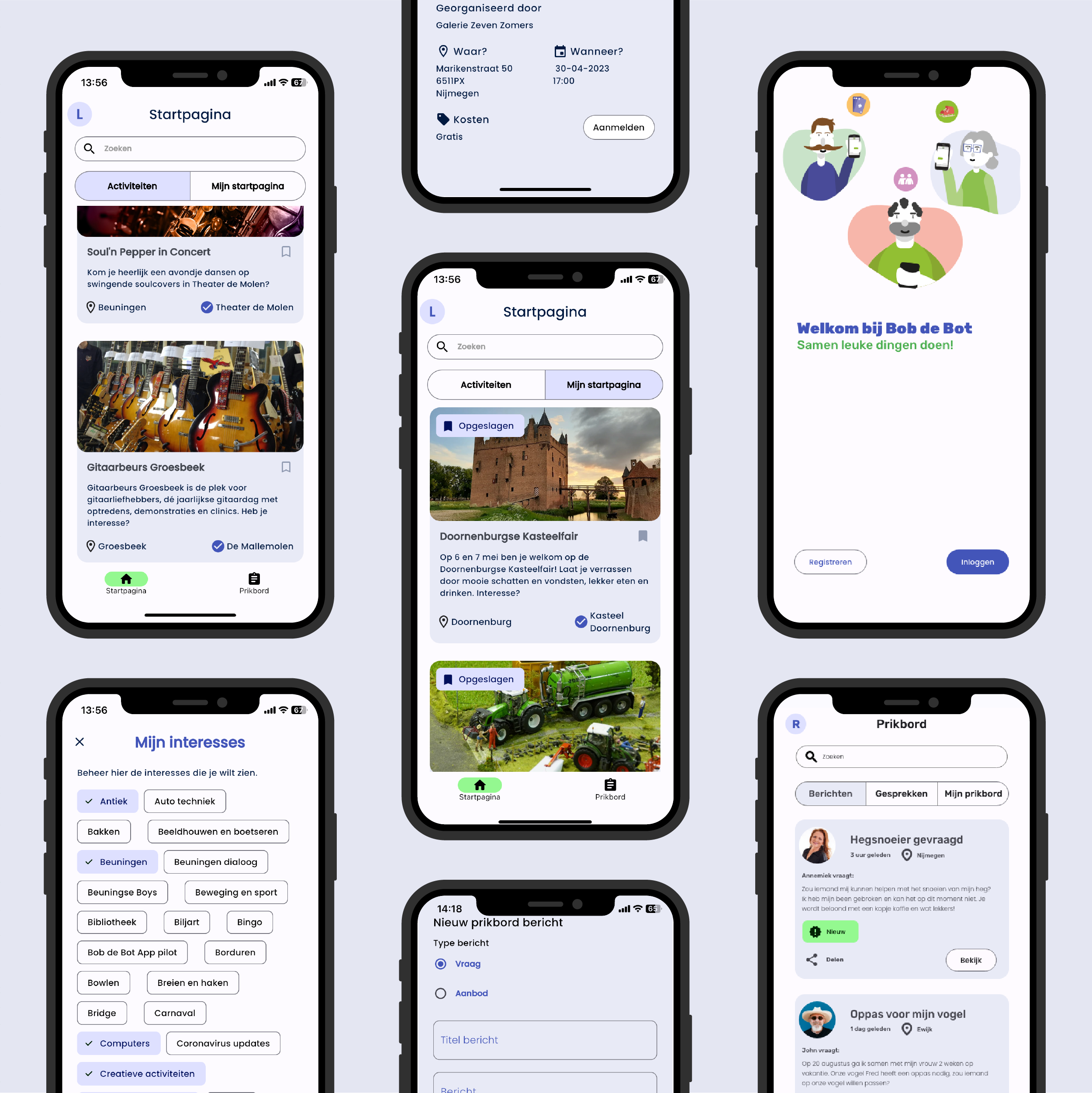Bob de Bot's mobile app is an extension of the existing system, which consists solely of SMS messages. The SMS messages are sent based on the user's location and interests. Through these messages, users connect with nearby activities so they do not become isolated. The app does the same, but from here, someone can immediately sign up for an activity. Have they met nice people? Stay in touch via the app.