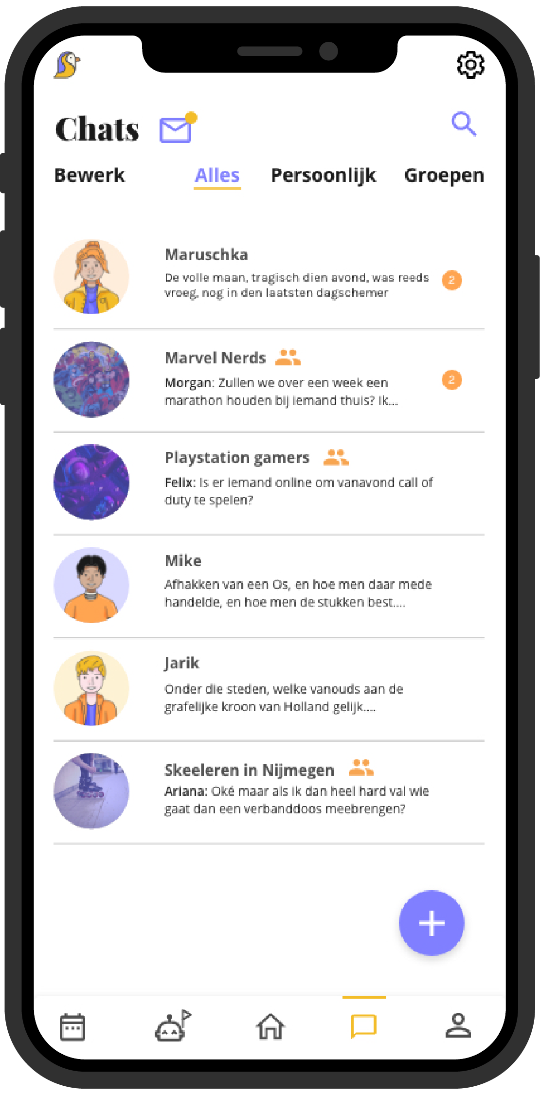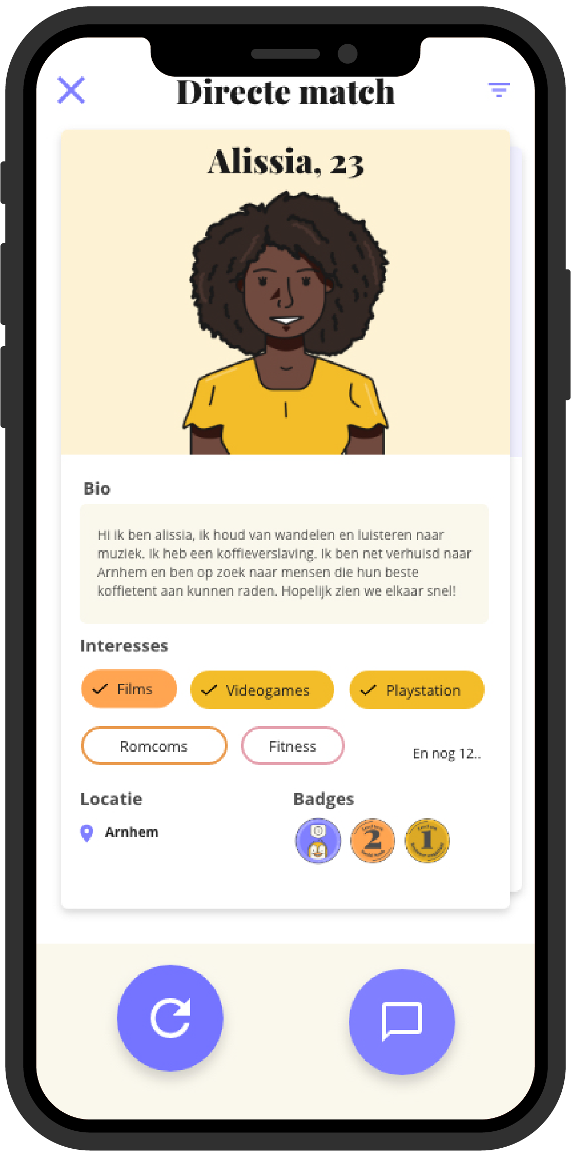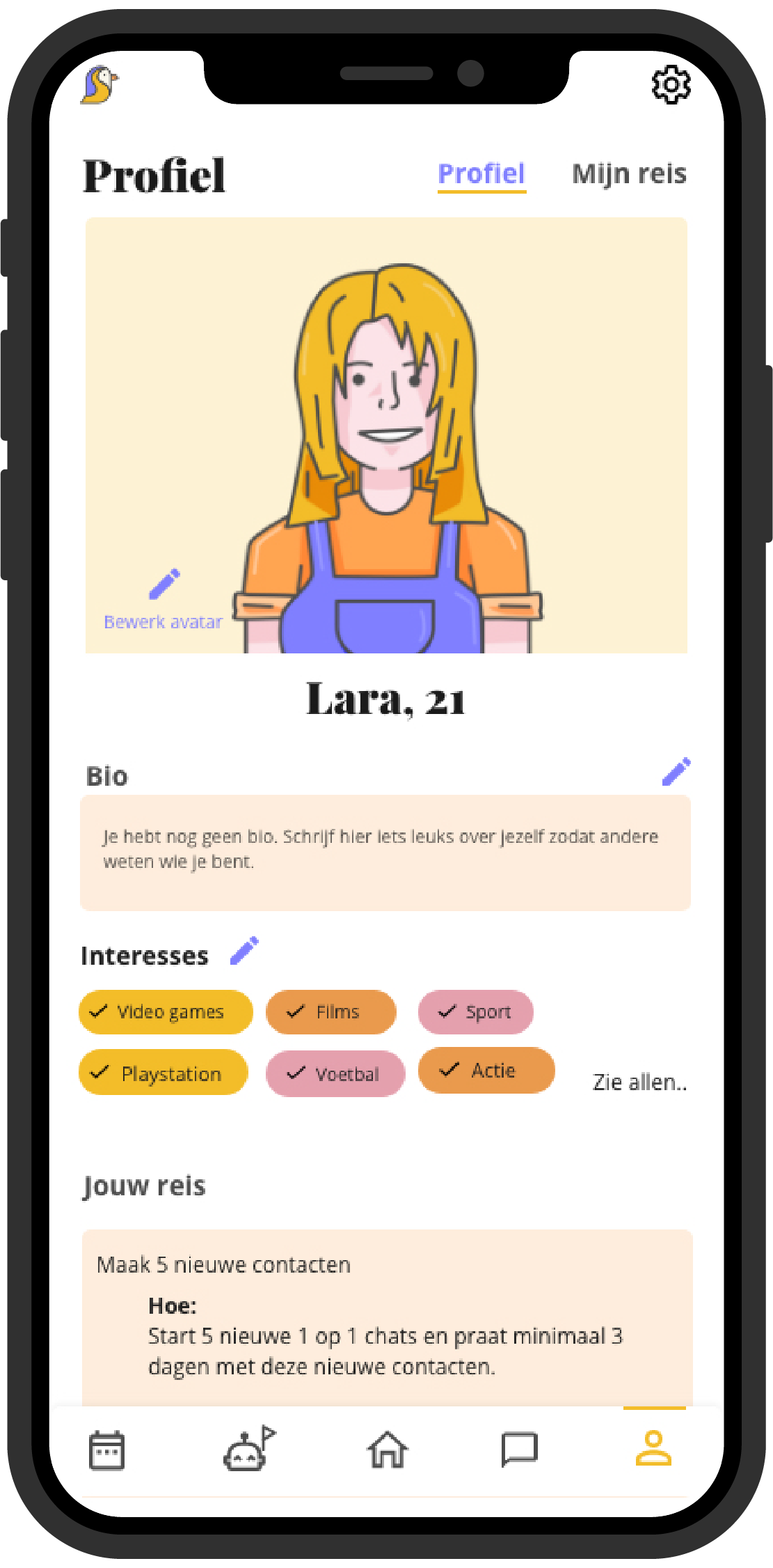 The application is a mobile app. The application uses avatars so that the pressure of the 'perfect image' online is removed and the target group dares to be more themselves online, enabling them to make genuine connections. The application includes an activity finder and a game to meet new people. In this game, you go through a number of questions together to get to know each other better; this establishes initial contact and provides things you can talk about.
