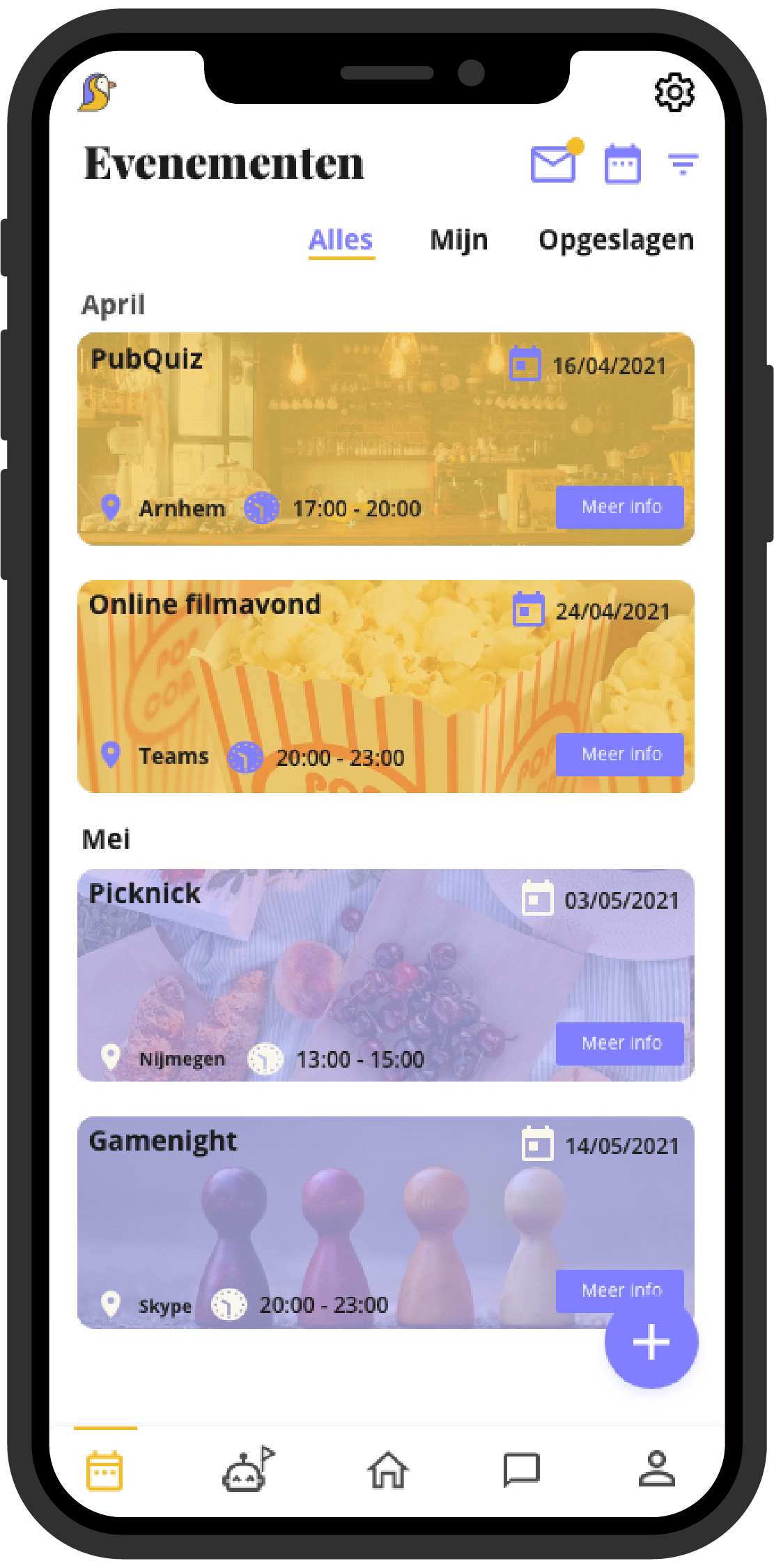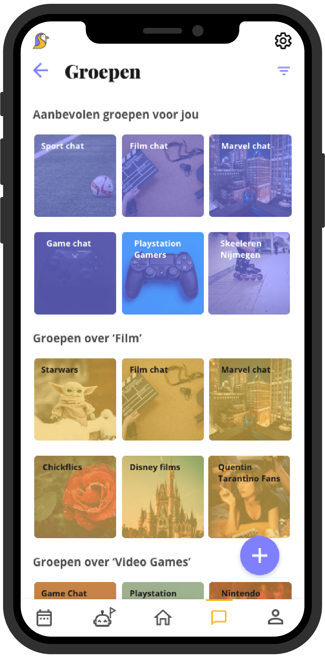 Waddle is my graduation project. The project involved developing an online platform for lonely young people. Waddle is an app that connects young people based on interests and allows them to attend local activities together. Through gamification, finding new people becomes a game, which motivates the user to return to the app.