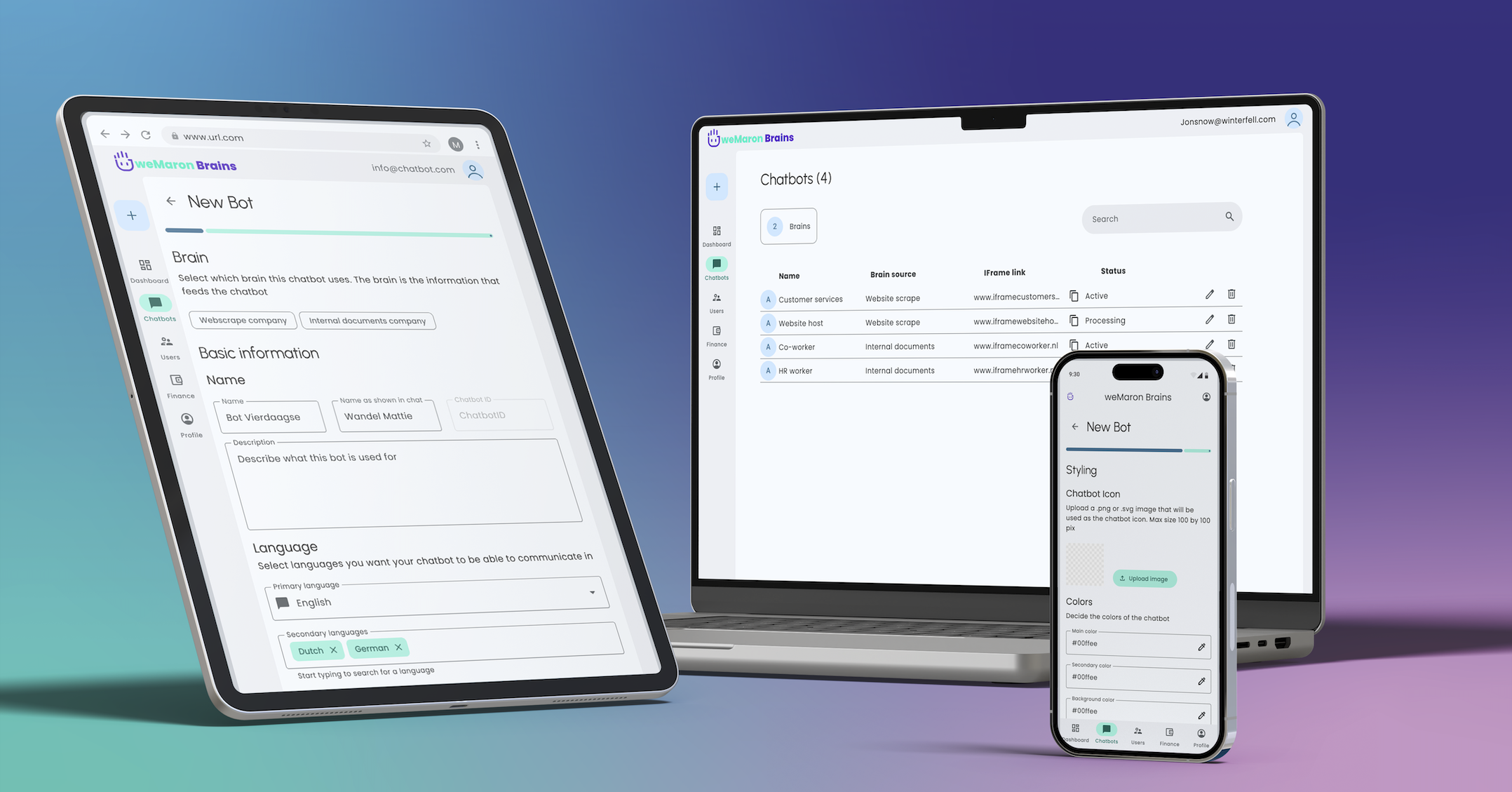 weMaron Brains is an AI chatbot platform where you can create your own chatbot within minutes. The chatbot can be used on websites of small businesses. The client asked for a modern, friendly look that feels trustworthy and technical. The user interface of the application must use material design 3 rules. The challenge of this project was to make sure the difficult process of creating a chatbot was made accessible to the general public
