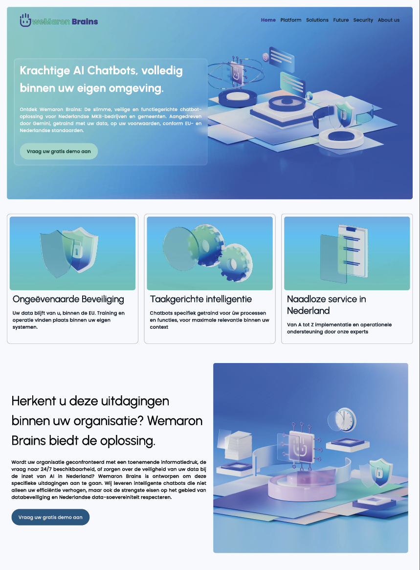 The chosen colors focus on the technical side of weMaron brains. By using different shades of blue in combination with purple we create a trustworthy, technical but freindly look. The branding uses 3D illustrations for a futuristic vibe. The illustrations are made out of simple shapes and use soft gradients to remain modern yet friendly.